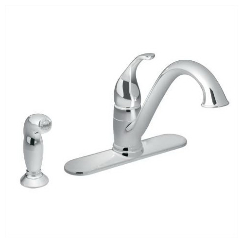 Moen® Camerist™ Transitional Kitchen Faucet, Commercial/Residential, Reliable, 1.5 gpm, Low Arc, Fixed Spout, 9-1/4 Inch Spout Reach, 6-1/8 Inch Spout Height, 1255™ Duralast™, Washerless Ceramic Disc Cartridge, Metal Lever Handle, 1-Handle, 2 - 4 Faucet Holes, 3/8 Inch Compression, Spray Pattern: Side, 1-1/8 Inch Maximum Deck Thickness, Deck Mount, 8-1/2 Inch H, Metal, Chrome, Includes: Side Spray with Hydrolock® Quick Connect System and Mounting Hardwares