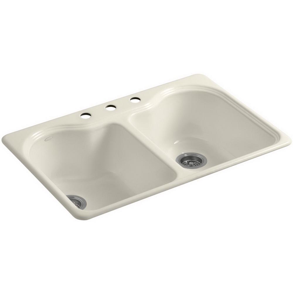 Kohler® Hartland® K-5818-3 Kitchen Sink, Rectangular, 22 Inch Overall Height, 33 Inch Overall Width, 9-5/8 Inch Overall Depth, Enameled Cast Iron, Cane Sugar, 2 Basins, 14-1/8 Inch L x 16-1/4 Inch W x 9 Inch D Left Basin, 14-1/8 Inch L x 16-1/4 Inch W x 9 Inch D Right Basin, 3 Faucet Holes, 1-3/8 Inch Faucet Hole, 4 Inch Faucet Center, Drop-In, Top Mount, 3-7/8 Inch Drain, 36 Inch W Cabinet, Includes: 1054375 23 Inch Undermount Sink Kit and 1125670-7 Cut-Out Template