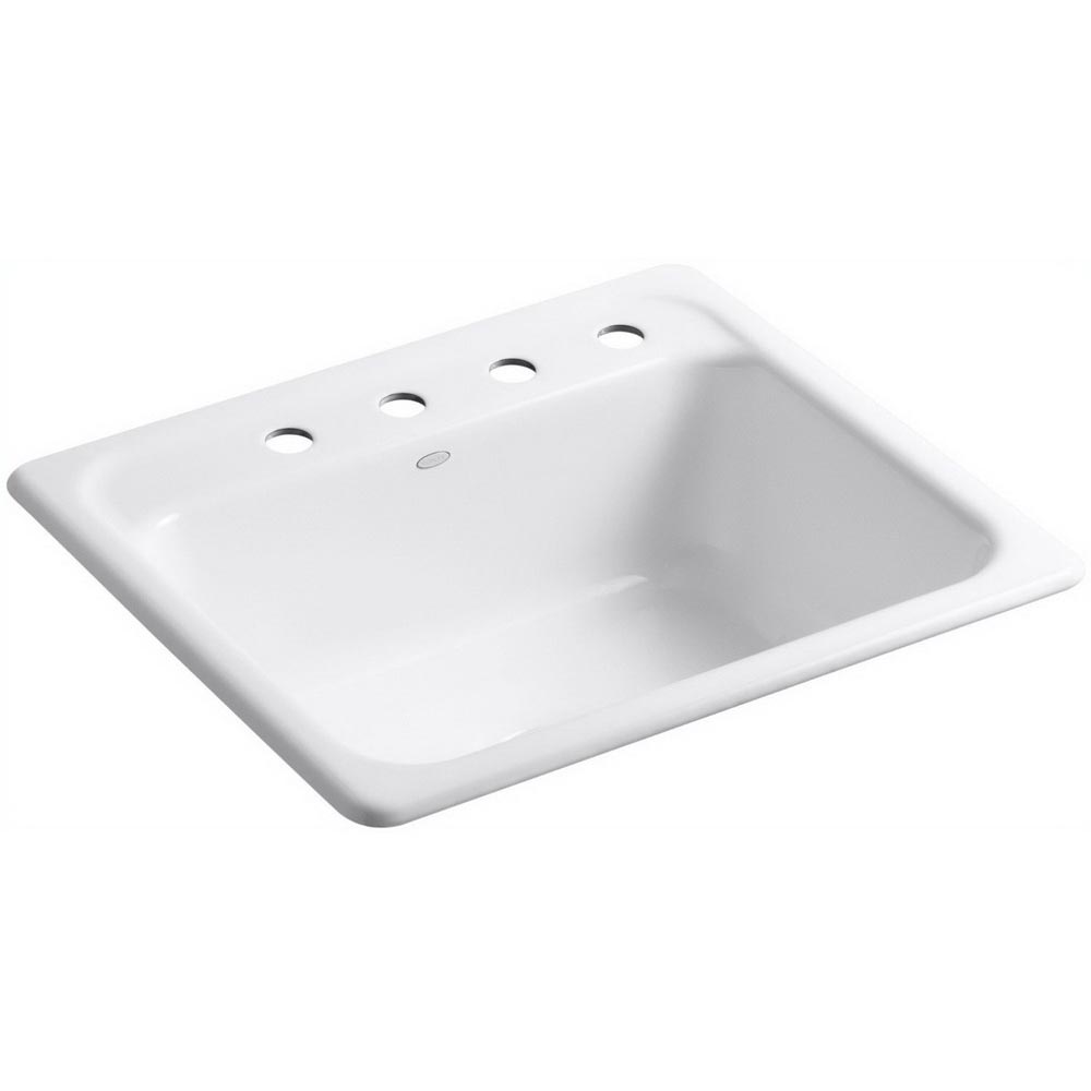 Kohler® Mayfield™ Traditional K-5964-4 Kitchen Sink, Rectangular, 22 Inch Overall Height, 25 Inch Overall Width, 8-3/4 Inch Overall Depth, Enameled Cast Iron, White, 1 Basin, 22 Inch L x 15 Inch W x 7-3/4 Inch D Center Basin, 4 Faucet Holes, 1-3/8 Inch Faucet Hole, 4 Inch Faucet Center, Drop-In, Top Mount, 3-5/8 Inch Drain, 27 Inch W Cabinet, Includes: Installation Hardware