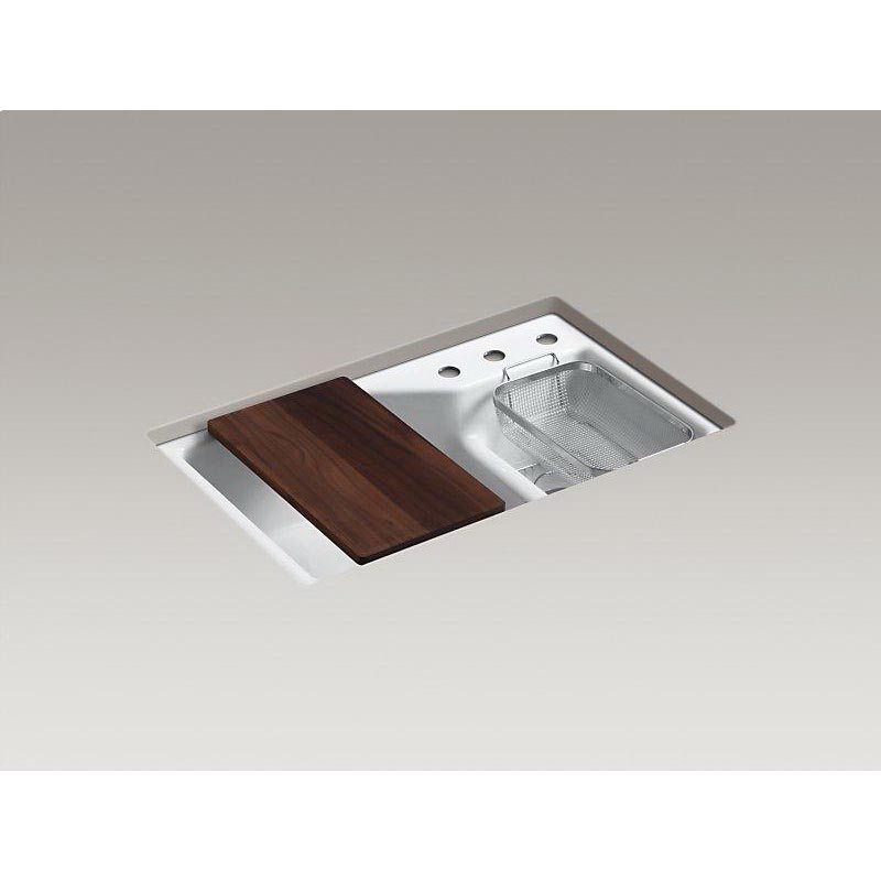 Kohler® Indio® Modern K-6411-3 Kitchen Sink, Rectangular, 21-1/8 Inch Overall Height, 33 Inch Overall Width, 9-3/4 Inch Overall Depth, Enameled Cast Iron, White, 2 Basins, 26 Inch L x 16-3/4 Inch W x 9 Inch D Left Basin, 26 Inch L x 16-3/4 Inch W x 9 Inch D Right Basin, 3 Faucet Holes, 1-3/8 Inch Faucet Hole, 4 Inch Faucet Center, Undermount, 3-7/8 Inch Drain, 36 Inch W Cabinet, Includes: 1054375 23 Inch Undermount Sink Kit, 1106715-7 Cut-Out Template, Bowl Racks, Walnut Cutting Board and Colander