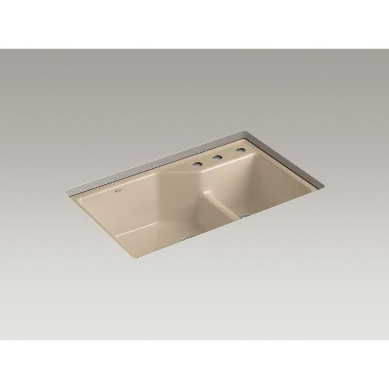 Kohler® Indio® Modern K-6411-3 Kitchen Sink, Rectangular, 21-1/8 Inch Overall Height, 33 Inch Overall Width, 9-3/4 Inch Overall Depth, Enameled Cast Iron, Mexican Sand, 2 Basins, 26 Inch L x 16-3/4 Inch W x 9 Inch D Left Basin, 26 Inch L x 16-3/4 Inch W x 9 Inch D Right Basin, 3 Faucet Holes, 1-3/8 Inch Faucet Hole, 4 Inch Faucet Center, Undermount, 3-7/8 Inch Drain, 36 Inch W Cabinet, Includes: 1054375 23 Inch Undermount Sink Kit, 1106715-7 Cut-Out Template, Bowl Racks, Walnut Cutting Board and Colander