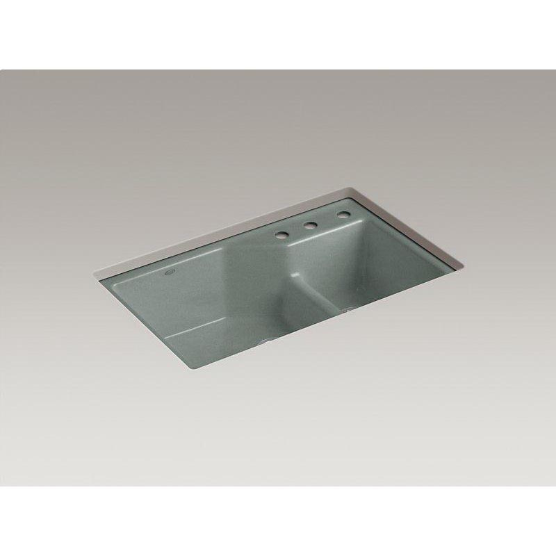 Kohler® Indio® Modern K-6411-3 Kitchen Sink, Rectangular, 21-1/8 Inch Overall Height, 33 Inch Overall Width, 9-3/4 Inch Overall Depth, Enameled Cast Iron, Basalt, 2 Basins, 26 Inch L x 16-3/4 Inch W x 9 Inch D Left Basin, 26 Inch L x 16-3/4 Inch W x 9 Inch D Right Basin, 3 Faucet Holes, 1-3/8 Inch Faucet Hole, 4 Inch Faucet Center, Undermount, 3-7/8 Inch Drain, 36 Inch W Cabinet, Includes: 1054375 23 Inch Undermount Sink Kit, 1106715-7 Cut-Out Template, Bowl Racks, Walnut Cutting Board and Colander