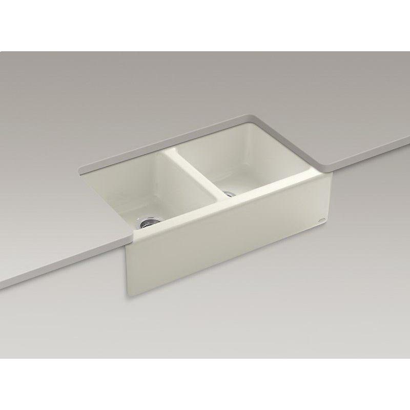 Kohler® Hawthorne™ K-6534-4U Kitchen Sink, Rectangular, 22-1/8 Inch Overall Height, 33 Inch Overall Width, 8-3/4 Inch Overall Depth, Enameled Cast Iron, Biscuit, 2 Basins, 14 Inch L x 15 Inch W x 8 Inch D Left Basin, 14 Inch L x 15 Inch W x 8 Inch D Right Basin, 4 Faucet Holes, 2-3/8 Inch Faucet Hole, 4 Inch Faucet Center, Apron Front, Undermount, 3-5/8 Inch Drain, 33 Inch W Cabinet, Includes: Mounting Hardware