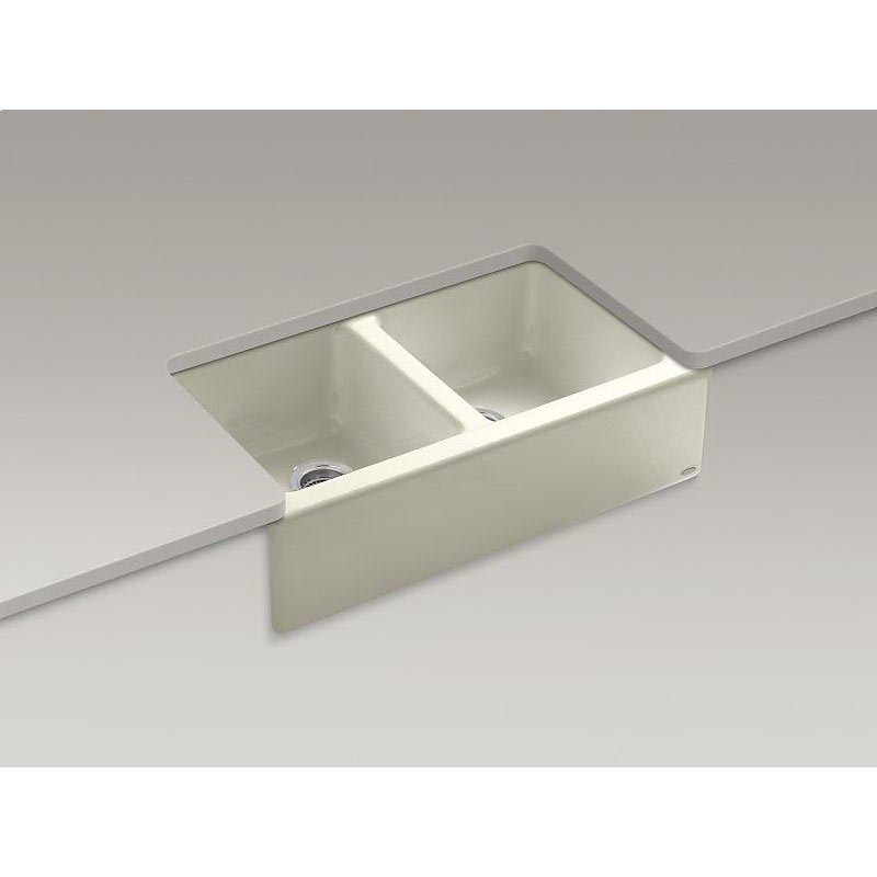 Kohler® Hawthorne™ K-6534-4U Kitchen Sink, Rectangular, 22-1/8 Inch Overall Height, 33 Inch Overall Width, 8-3/4 Inch Overall Depth, Enameled Cast Iron, Cane Sugar, 2 Basins, 14 Inch L x 15 Inch W x 8 Inch D Left Basin, 14 Inch L x 15 Inch W x 8 Inch D Right Basin, 4 Faucet Holes, 2-3/8 Inch Faucet Hole, 4 Inch Faucet Center, Undermount Apron Front Mount, 3-5/8 Inch Drain, 33 Inch W Cabinet, Includes: Mounting Hardware