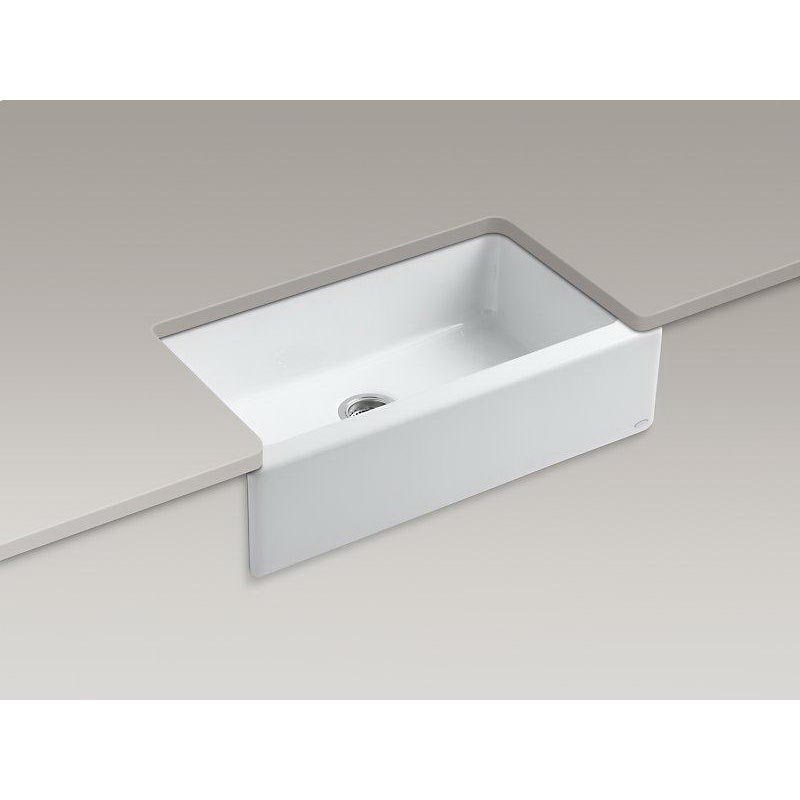 Kohler® Dickinson™ K-6546-4U Kitchen Sink, Rectangular, 22-1/8 Inch Overall Height, 33 Inch Overall Width, 8-3/4 Inch Overall Depth, Enameled Cast Iron, White, 1 Basin, 30 Inch L x 15 Inch W x 8 Inch D Center Basin, 4 Faucet Holes, 2-3/8 Inch Faucet Hole, 8 Inch Faucet Center, Apron Front, Undermount, 3-5/8 Inch Drain, Includes: Mounting Hardware