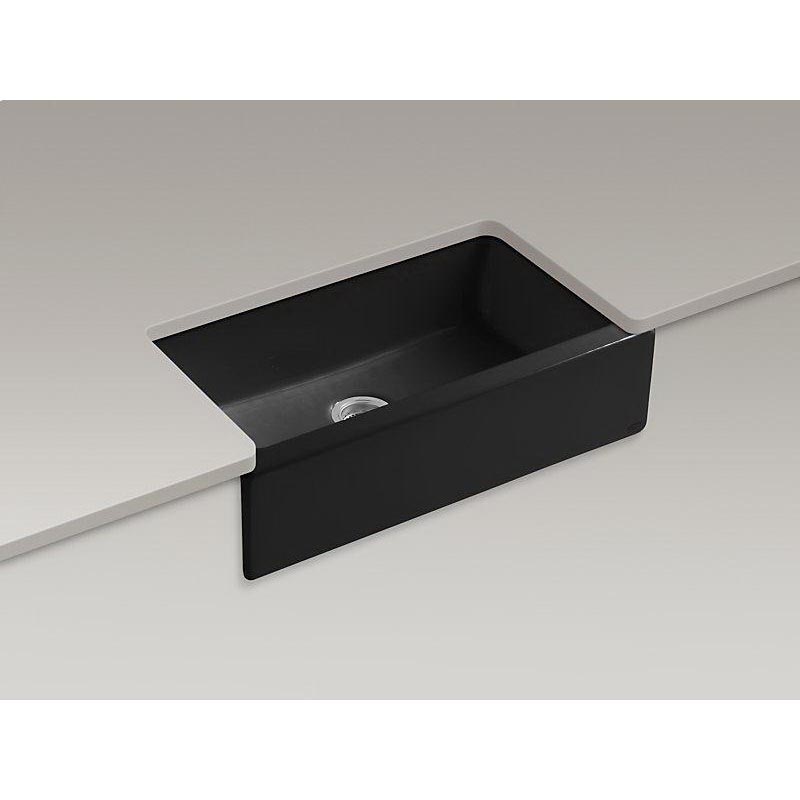 Kohler® Dickinson™ K-6546-4U Kitchen Sink, Rectangular, 22-1/8 Inch Overall Height, 33 Inch Overall Width, 8-3/4 Inch Overall Depth, Enameled Cast Iron, Black, 1 Basin, 30 Inch L x 15 Inch W x 8 Inch D Center Basin, 4 Faucet Holes, 2-3/8 Inch Faucet Hole, 8 Inch Faucet Center, Apron Front, Undermount, 3-5/8 Inch Drain, Includes: Mounting Hardware