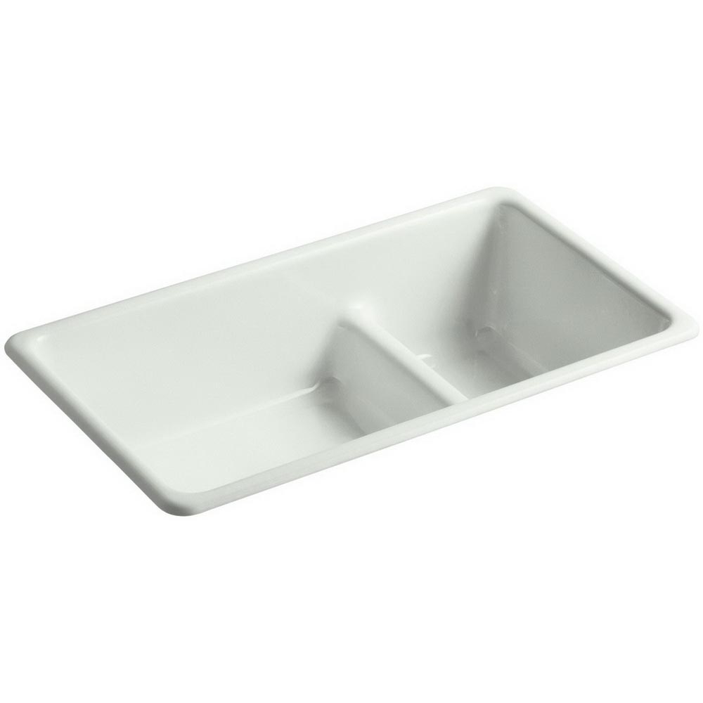 Kohler® Iron/Tones® Traditional K-6625 Kitchen Sink, Large/Medium, Rectangular, 18-3/4 Inch Overall Height, 33 Inch Overall Width, 9-5/8 Inch Overall Depth, Enameled Cast Iron, Sea Salt, 2 Basins, 30 Inch L x 16 Inch W x 9 Inch D Left Basin, 30 Inch L x 16 Inch W x 9 Inch D Right Basin, Drop-In, Top Mount,Undermount, 3-7/8 Inch Drain, 33 Inch W Top Mount, 36 Inch W Undermount Cabinet, Includes: 1054375 23 Inch Undermount Sink Kit and 1043168-7 Cut-Out Template