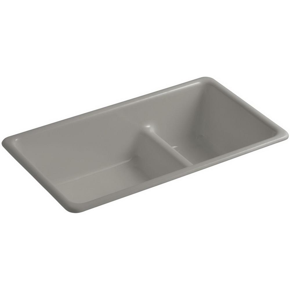 Kohler® Iron/Tones® Traditional K-6625 Kitchen Sink, Large/Medium, Rectangular, 18-3/4 Inch Overall Height, 33 Inch Overall Width, 9-5/8 Inch Overall Depth, Enameled Cast Iron, Cashmere, 2 Basins, 30 Inch L x 16 Inch W x 9 Inch D Left Basin, 30 Inch L x 16 Inch W x 9 Inch D Right Basin, Drop-In, Top Mount,Undermount, 3-7/8 Inch Drain, 33 Inch W Top Mount, 36 Inch W Undermount Cabinet, Includes: 1054375 23 Inch Undermount Sink Kit and 1043168-7 Cut-Out Template