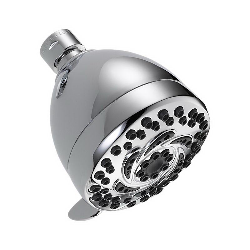 Delta® 52635 Basic Modern Shower Head, Round, Universal, 2.5 gpm at 80 psi, 3-1/2 Inch Face Dia, 1/2 Inch, Spray Pattern: Full Body Spray, Full Spray with Massage, Massage Spray, Soft Drench Spray, Soft Drench with Full Spray, 5 Spray Functions, 4-11/32 Inch, Brass, Chrome