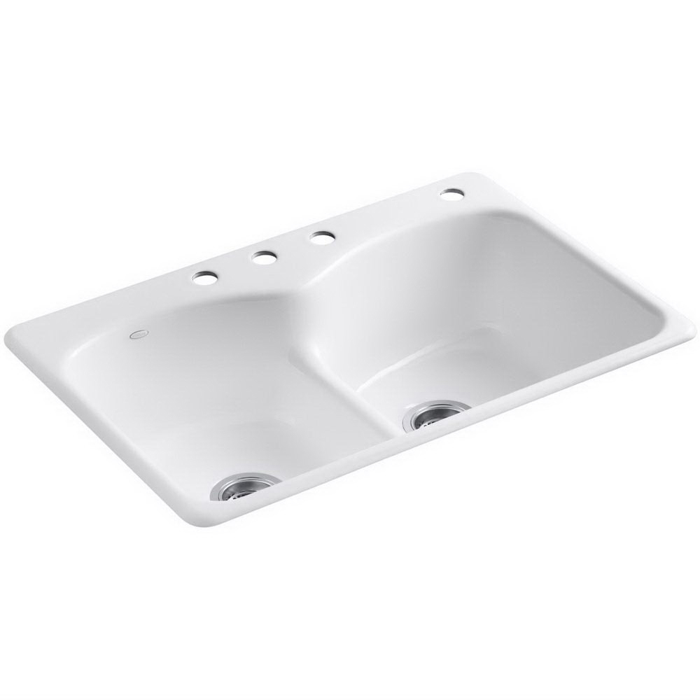 Kohler® Langlade® K-6626-4 Kitchen Sink, Rectangular, 22 Inch Overall Height, 33 Inch Overall Width, 9-5/8 Inch Overall Depth, Enameled Cast Iron, White, 2 Basins, 15 Inch L x 18-3/8 Inch W x 9 Inch D Left Basin, 15 Inch L x 18-3/8 Inch W x 9 Inch D Right Basin, 4 Faucet Holes, 1-3/8 Inch Faucet Hole, 4 Inch Faucet Center, Drop-In, Top Mount, 3-5/8 Inch Drain, 33 Inch W Cabinet, Includes: 1043753-7 Cut-Out Template