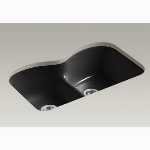 Kohler® Langlade® K-6626-6U Kitchen Sink, Rectangular, 22 Inch Overall Height, 33 Inch Overall Width, 9-5/8 Inch Overall Depth, Enameled Cast Iron, Black, 2 Basins, 15 Inch L x 18-3/8 Inch W x 9 Inch D Left Basin, 15 Inch L x 18-3/8 Inch W x 9 Inch D Right Basin, 6 Faucet Holes, 2-3/8 Inch Faucet Hole, 4 Inch Faucet Center, Undermount, 3-7/8 Inch Drain, 35 Inch W Cabinet, Includes: 1054375 23 Inch Undermount Sink Kit and 1043754-7 Cut-Out Template