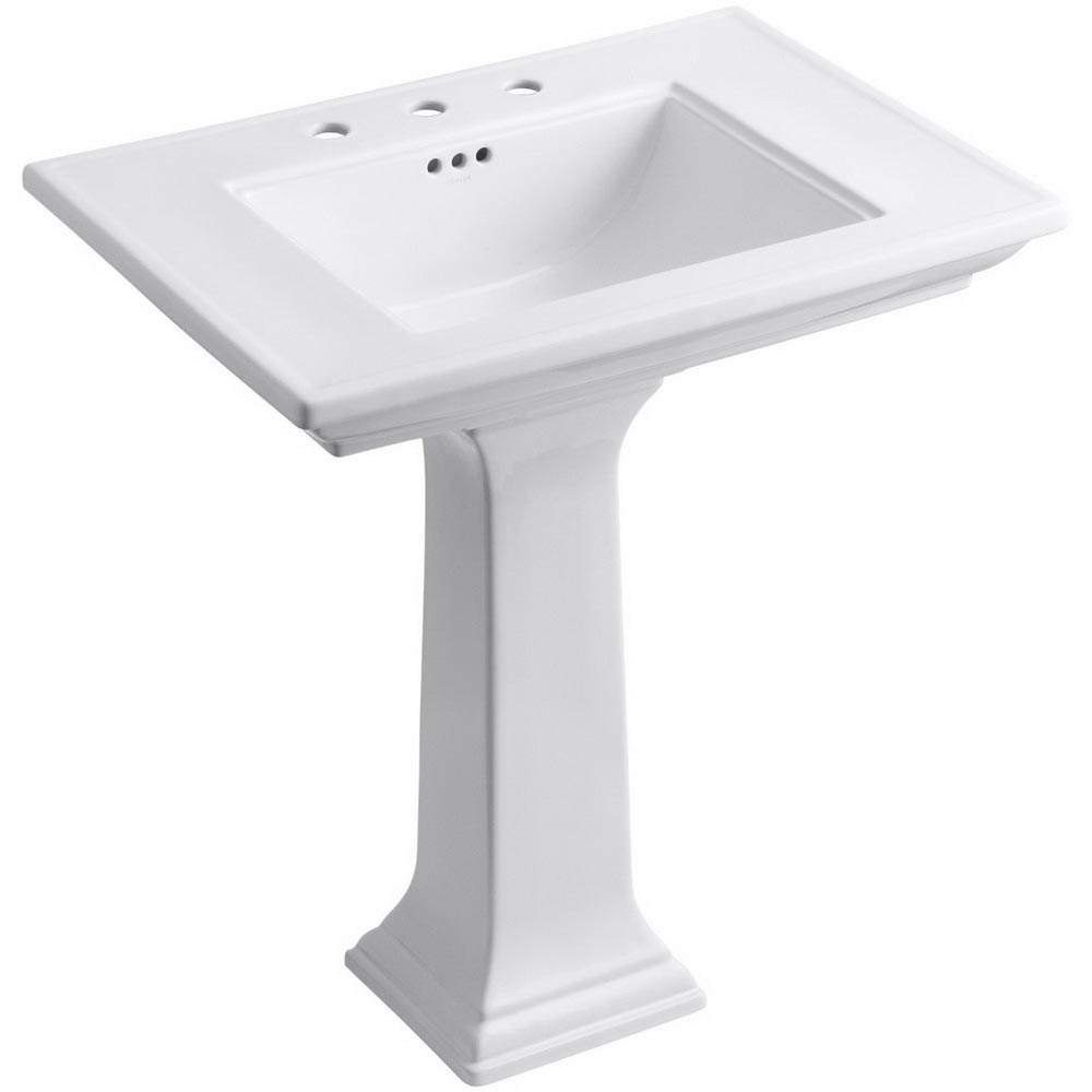Kohler® Memoirs® Stately Traditional K-2268-8 Bathroom Sink, Rectangular, 21-3/4 Inch Overall Height, 30 Inch Overall Width, 34-3/4 Inch Overall Depth, Fireclay, White, 1 Basin, 18 Inch L x 14 Inch W x 5 Inch D Center Basin, 3 Faucet Holes, 1-3/8 Inch Faucet Hole, 8 Inch Faucet Center, Single Pedestal, Widespread Mount, 1-3/4 Inch Drain, Includes: 52204 Accessory Pack and 63069 Rubber Pads