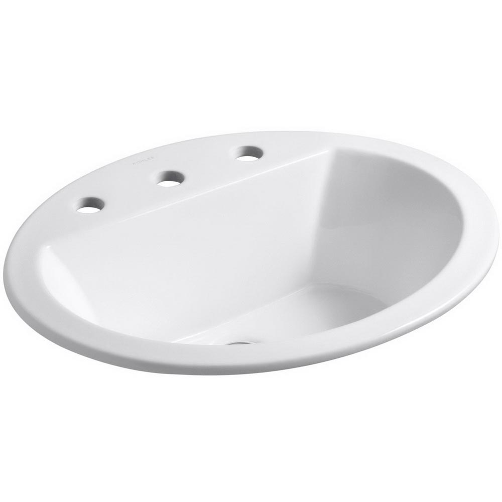 Kohler® Bryant® Traditional K-2699-8 Bathroom Sink, Oval, 16-1/2 Inch Overall Height, 20-1/8 Inch Overall Width, 7-5/8 Inch Overall Depth, Vitreous China, White, 1 Basin, 17-3/8 Inch L x 11-1/8 Inch W x 5-5/8 Inch D Center Basin, 3 Faucet Holes, 1-3/8 Inch Faucet Hole, 8 Inch Faucet Center, Centerset, Drop-In Mount, 7/8 Inch Drain, Includes: 1155261-7 Drop-In Template and Mounting Hardwares