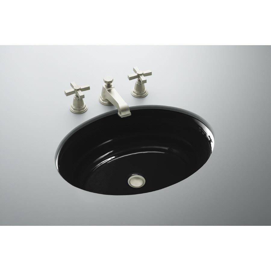 Kohler® Garamond® Traditional K-2832 Bathroom Sink, Oval, 16-1/4 Inch Overall Height, 21-1/16 Inch Overall Width, 7-9/16 Inch Overall Depth, Enameled Cast Iron, Black, 1 Basin, 19-5/8 Inch L x 15 Inch W x 5-1/2 Inch D Center Basin, Undermount, 1-3/4 Inch Drain, Includes: 52047 Basin Clamp Assembly and 1046629-7 Cut-Out Template