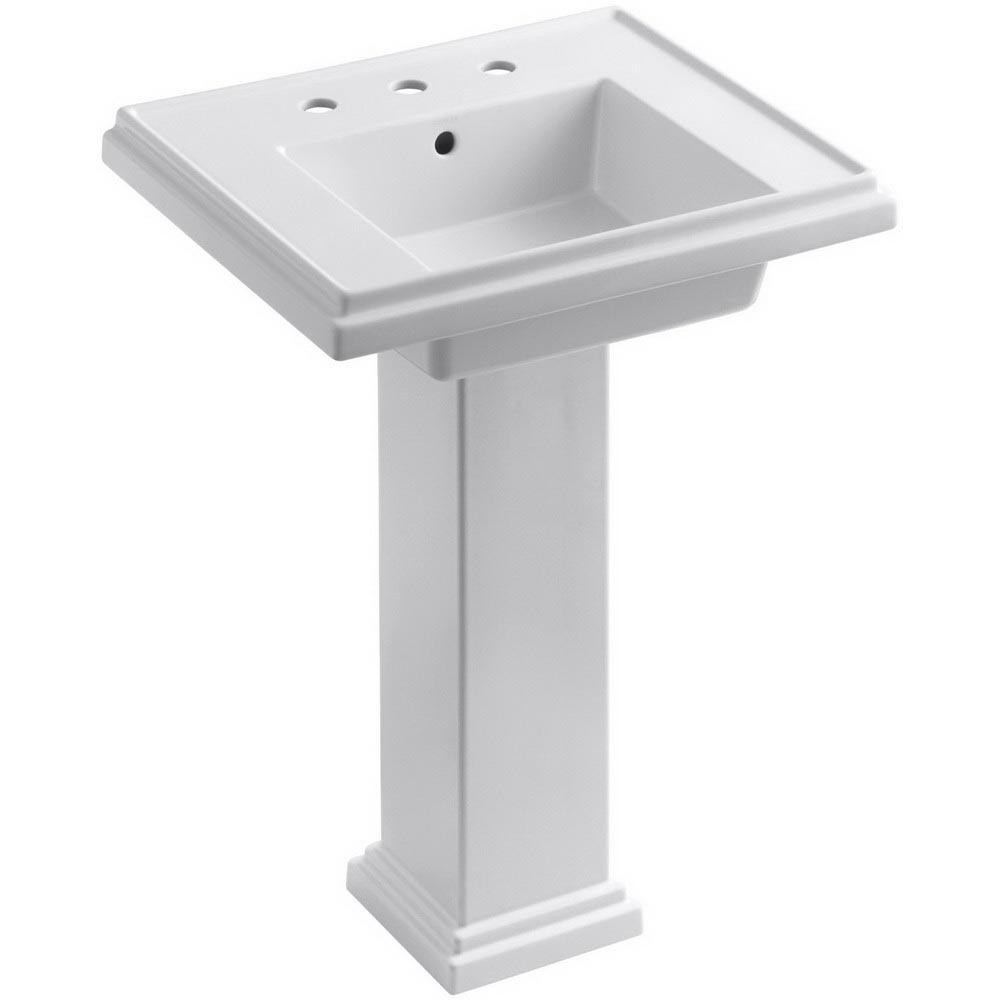 Kohler® Tresham® Modern K-2844-8 Bathroom Sink, Square, 19-1/2 Inch Overall Height, 24 Inch Overall Width, 34-5/8 Inch Overall Depth, Fireclay, White, 1 Basin, 14-1/4 Inch L x 12-1/2 Inch W x 3-1/4 Inch D Center Basin, 3 Faucet Holes, 1-3/8 Inch Faucet Hole, 8 Inch Faucet Center, Single Pedestal, Widespread Mount, 1-3/4 Inch Drain, Includes: 52204 Pedestal Accessory Pack, 63069 Rubber Pads, K-2757-1 Basin and K-2767 Pedestal