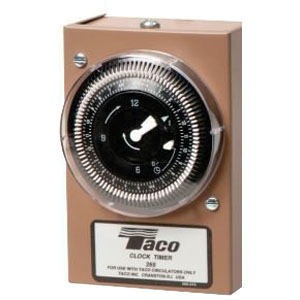 The Taco Clock Timers and Temperature Aquastat are designed to operate Taco circulators for domestic hot water recirculation during peak demand periods. The 24-hour clock timer can be set in 15 minute on/off intervals. A digital 7-day programmable timer can be set to run at varying times and intervals each day. The timer enclosures feature rugged steel construction.