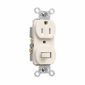 Pass & Seymour® Combination Switch and Receptacle, Commercial Grade, Duplex, Single Pole, Toggle Switch, Switch Rating: 15 A, 120/125 VAC, Tamper-Resistant, Straight Blade Receptacle, 15 A, 120/125 VAC Receptacle, 1 Receptacles, 12 AWG and 14 AWG Side Wire, NEMA 5-15R, 1.32 Inch W x 3.81 Inch H x 1.15 Inch D, Light Almond