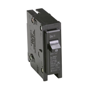 Cutler Hammer Series BR Circuit Breaker, Commercial/Residential, 120/240 VAC, 15 A, 10 kA Interrupt, Thermal Magnetic Trip, 1 Pole, Toggle Handle Actuator, 14 - 4 AWG Aluminum/Copper Wire, Plug-On Mount, 60 - 75 deg C, 3 Inch L x 1 Inch W x 3 Inch H