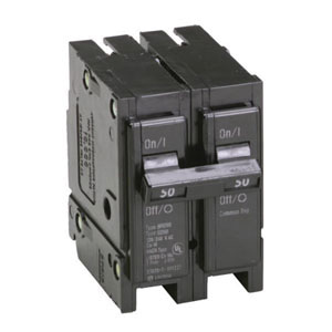Cutler Hammer Series BR Circuit Breaker, Commercial/Residential, 120/240 VAC, 50 A, 10 kA Interrupt, Common, Thermal Magnetic Trip, 2 Pole, Toggle Handle Actuator, 14 - 4 AWG Aluminum/Copper Wire, Plug-On Mount, 60 - 75 deg C, 3 Inch L x 2 Inch W x 3 Inch H