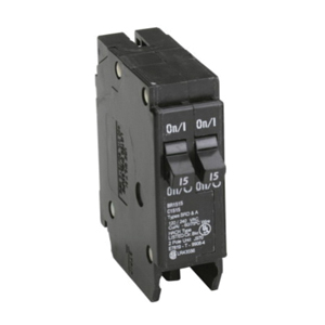 Cutler Hammer Series BR Circuit Breaker, Duplex, Light Commercial/Residential Commercial/Residential, 120/240 VAC, (2) 15 A, 10 kA Interrupt, Thermal Magnetic, Instantaneous Trip, 1 Pole, Toggle Handle Actuator, Plug-In, 14 - 4 AWG Aluminum/Copper Wire, Plug-On Mount, 60 to 75 deg C, 3 Inch L x 1 Inch W x 3 Inch H
