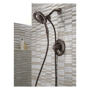 DELTA® Shower Trim, Linden™, Monitor® 17, Traditional, 2 gpm, 6-1/2 Inch Spout Reach, Lever Handle, 2 Handles, Round Single Function Shower Head, 2 gpm Shower Head, 6 Inch W Shower Head, Shower Head Spray Pattern: Full Body, Pause, Full Spray with Massage, Fast Massage, 4 Shower Head Spray Functions, 69 Inch L Hose, Dual-Function Pressure Balance Cartridge, Multi-Function In2ition® Hand Shower, 2 gpm Hand Shower, 11 in L Hand Shower, Hand Shower Spray Pattern: Full Body, Pause, Full Spray with Massage, Fast Massage, 4 Hand Shower Spray Functions, Wall Mount, Solid Brass, Venetian® Bronze, Includes: Valve Trim, Shower Arm and Shower Head