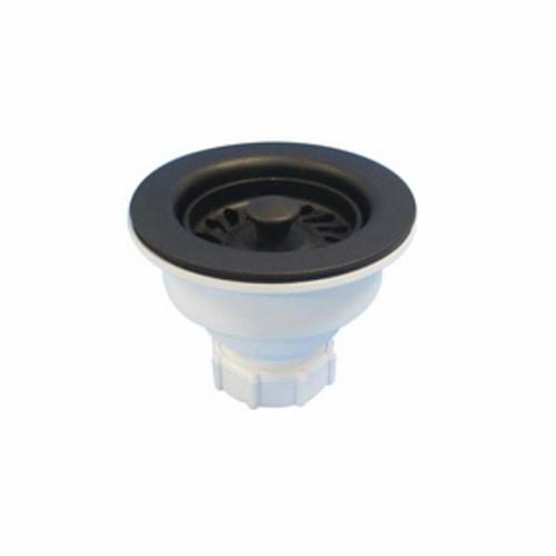 Kitchen strainer matte black, clam shell. This is a two piece strainer with celcon trim and a plastic base. It is assembled with a center bolt and will mount on sinks up to 5/8 Inch THK. A longer bolt is available to use on sinks up to 2-3/4 Inch THK, part number G106000. A replacement basket is available part number JBX138M.