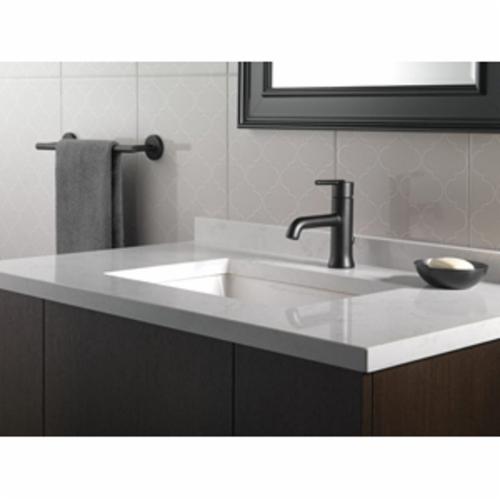 DELTA® Bathroom Faucet, Series: Trinsic®, 1.2 gpm at 60 psi, 5 Inch Spout Reach, 3-1/2 Inch Spout Height, Diamond Coated Ceramic Cartridge, Lever Handle, 1 Handle, 1 or 3 Faucet Holes, 3/8 Inch Compression, 2-1/4 Inch Maximum Deck Thickness, 19-3/4 Inch L x 10-1/4 Inch W x 3-1/4 Inch H, Solid Brass, Matte Black, Includes: Metal Pop-Up Drain
