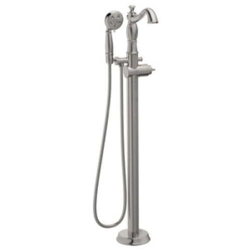 DELTA® Tub Filler Trim, Traditional, 1.75 gpm at 80 psi, 360 deg High Arc Swivel Spout, 8-1/2 Inch Spout Reach, 42-1/2 Inch Spout Height, 60 - 80 Inch Hose, Pressure Balancing Cartridge, 1 Handle, 1 Faucet Hole, Spray Pattern: Pause, Massaging Spray, H2Okinetic® Spray, 3 Spray Functions, 6-1/4 Inch Maximum Deck Thickness, Floor Mount, 42-1/2 Inch H, Solid Brass, Stainless, Includes: Hand Shower
