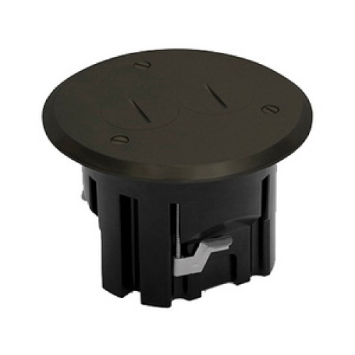 The Lew Electric PBR1-SPDB is a round plastic floor box with dark bronze cover. Inside the box you will find one 15 A duplex power receptacle with tamper proof plugs. The cover features two screw plugs that provide quick access to your outlets in the box. The box that houses the receptacles is made out of a lightweight polymer construction that offers huge savings over traditional metal floor boxes. The box is easy to install and the adjustable wing clamp adds additional installation support when installed, there are two knockouts in the box to run your wire. The floor box is ETL listed for the USA and cETL listed for Canada installations, it also conforms to UL code 514C.