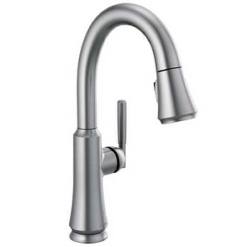 DELTA® Pull Down Bar/Prep Faucet, Series: Coranto™, 1.8 gpm, 8 Inch Center Distance, High-Arc/Gooseneck Spout, 9-3/8 Inch Spout Reach, 15-13/16 Inch Spout Height, 1 Handle, 2-1/2 Inch Maximum Deck Thickness, 14-3/8 Inch H, Arctic Stainless