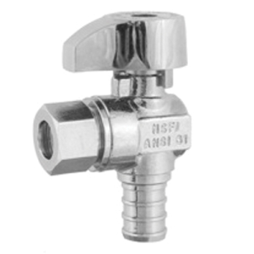 Matco-Norca™ Angle Supply Valve, Angled, 1/2 x 3/8 Inch Nominal, PEX x Compression End Style, 125 psi Pressure, Chrome-Plated Lead Free Brass Body, NBR O-Ring, PTFE Packing Softgoods, 32 - 160 deg F, Dimensions: 2.3 Inch L