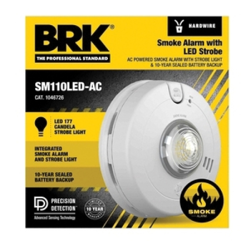 BRK® Smoke Alarm with LED Strobe, Sensing Technology: Photoelectric, 120 VAC, LED Display, Battery Power Source, 40 - 100 deg F, Dimensions: 5.3 in Inch L x 5.39 in Inch W x 3.15 Inch H, Warranty: 10 Year Limited