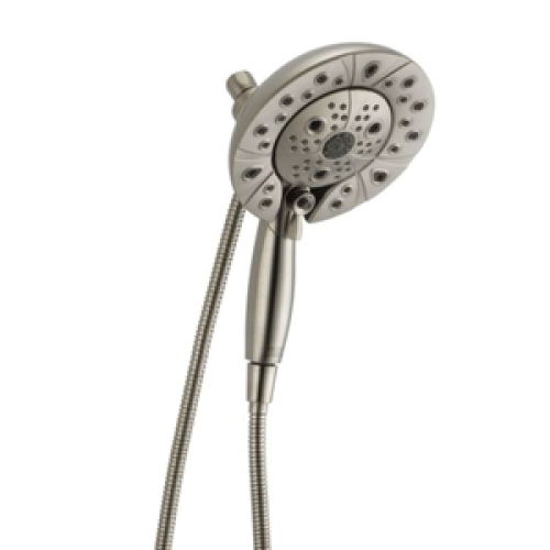 DELTA® 2-In-1 Shower, Series: 58480, 2.5 gpm Flow Rate, 6-7/8 Inch Diameter Face, 82 Inch Hose, NPT Connection, Spray Pattern: Full, Massage, 5 Spray Functions, Lumicoat® Stainless, Includes: 60 - 82 Inch Stretchable Metal Hose, Warranty: Limited Lifetime