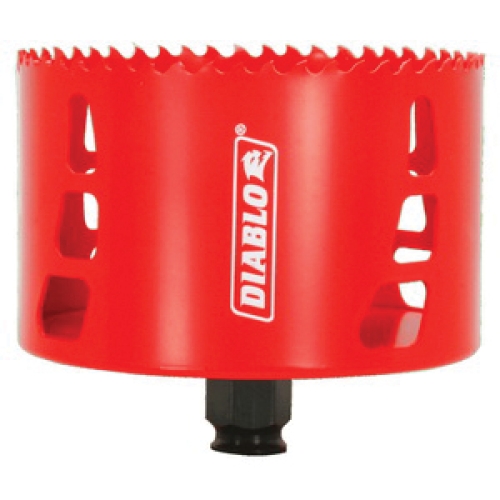 DIABLO® Hole Saw, 4-1/8 Inch Dia, 2-3/8 Inch Cutting Depth, 4, 3/8 Inch Arbor, 2-3/8 Inch Overall Length, Bi-Metal Cutting Edge, Variable Pitch Tooth, 3/8 Inch Chuck, 3/8 Inch Shank, Applicable Materials: Clean Wood, Hardwood, Plastic, Softwood, Steel