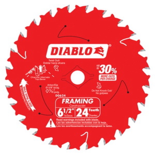 DIABLO® Framing Saw Blade, 6-1/2 Inch Dia, Carbide Cutting Edge, 0.039 Inch Blade Thickness, ATB Teeth, 24 Teeth, 5/8 Inch Arbor, 0.059 Inch Kerf, 18 deg Hook Angle, 8800 RPM Maximum Speed Rating, Cut Materials: Hardwood, Softwood, 2X Lumber, Pressure Treated, OSB, Laminated Beam, For Use With: General Construction, Framers, Roofers, Remodelers and Concrete Formers