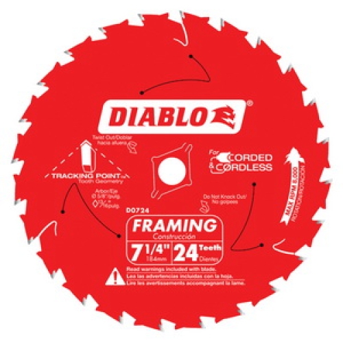 DIABLO® Framing Saw Blade, 7-1/4 Inch Dia, Carbide Cutting Edge, 0.04 Inch Blade Thickness, ATB Teeth, 24 Teeth, 5/8 Inch Arbor, 0.059 Inch Kerf, 18 deg Hook Angle, 8000 RPM Maximum Speed Rating, Cut Materials: Hardwood, 2X Lumber, Pressure Treated, OSB, Laminated Beam, For Use With: General Construction, Framers, Roofers, Remodelers and Concrete Formers